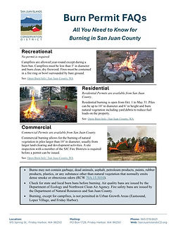 Permits are required for all kiln burns in San Juan County. Silvicultural burns may be permitted through either San Juan County or the Washington Department of Natural Resources. Agricultural burns must be permitted through the Northwest Clean Air Agency.